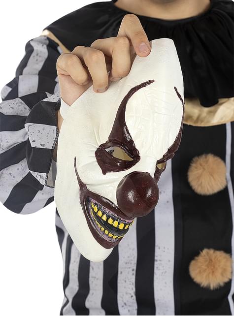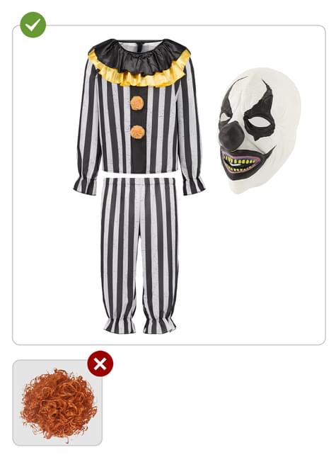 Navržen s ohledem na pohodlí, aniž by se obětoval vizuální dopad, tento kostým obsahuje tričko se pruhy v černé a bílé barvě se tmavým středovým panelem, beige pompomy šité a černý saténový límec s zlatou volánem, což přidává tu klasickou, zkroucenou atmosféru. Maskáčové kalhoty až do půli lýtek mají gumu na spodním okraji pro lepší přizpůsobení, a latexová maska předvádí groteskní úsměv, na který se nezapomíná. Vyrobeno z 100% polyesteru, bylo navrženo tak, abys mohl být svobodný, pohodlný a hrůzostrašný celou noc.