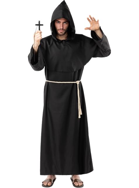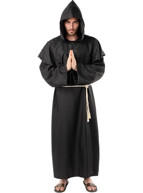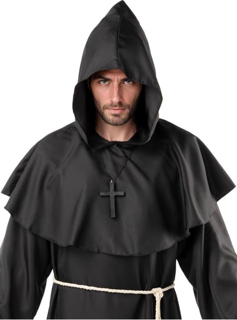 Zahrnuje široký hábit s kapucí, nastavitelný provazový opasek a řetěz s dřevěným křížem matného provedení. Vyrobeno z kvalitních materiálů polyester, bavlna, železo a dřevo, jeho volný střih zajišťuje pohodlí a volnost pohybu. Design obsahuje kratší překrytý plášť, rovné rukávy a jednoduché detaily, které posilují jeho mnichovský vzhled. Ideální pro výkon jak benevolentního mnichem, tak záhadného strážce chrámu.