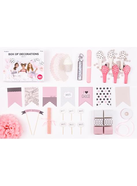 Obsahuje: 1 papírová girlanda, 6 košíčků na muffiny, 6 košíčků, 1 dekorace na dort, 10 brček, 6 balónků, 1 konfeta, 6 krabiček, 1 stuha, 6 píšťalek a 1 saténová stuha